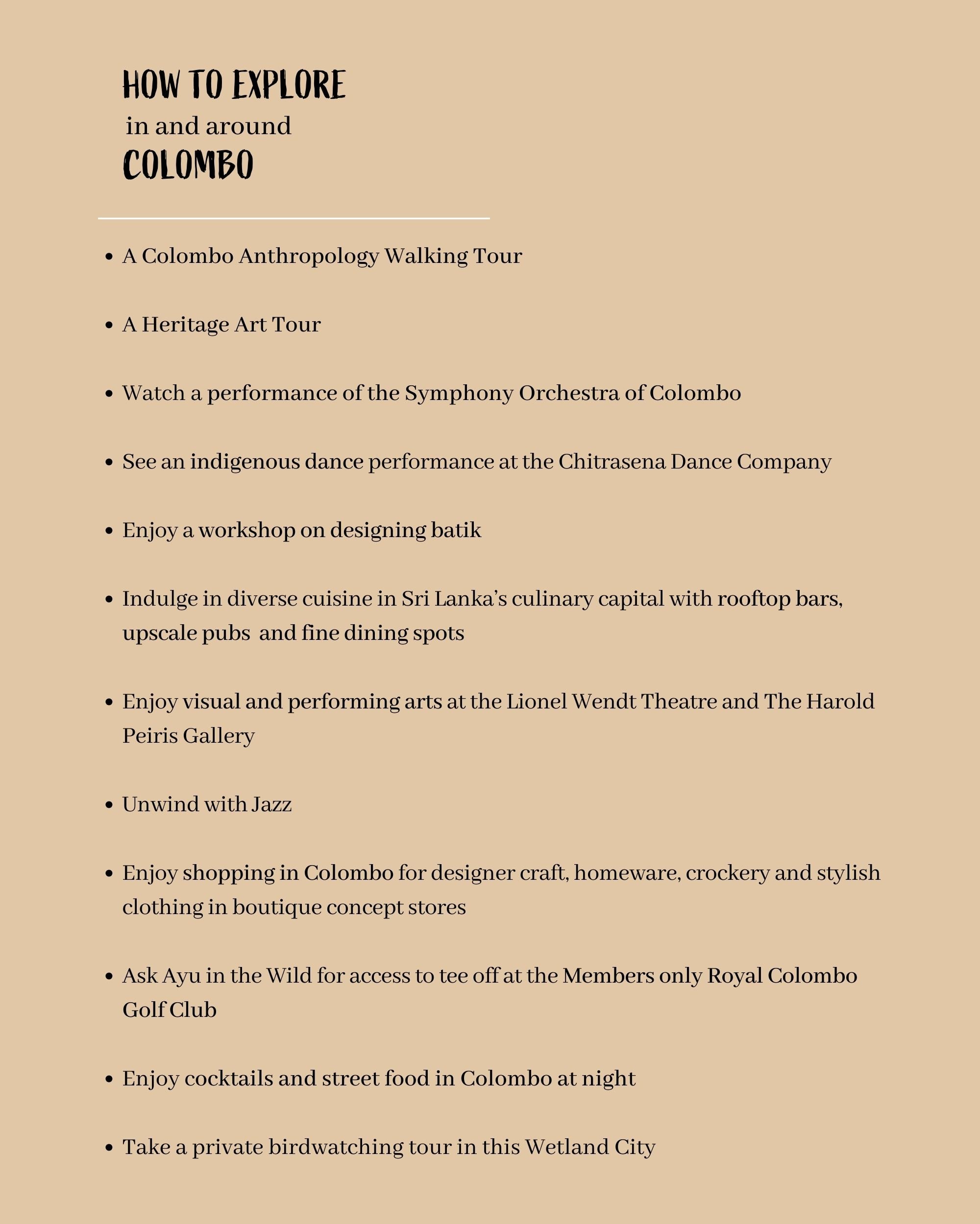 There’s an old-Colombo with layers of history, trade and street food within its labyrinth of narrow historic streets, and a contrasting cosmopolitan-Colombo with a chic, stylish vibe of pubs, bars, fine dining, jazz, classical music and brunch spots - that can only be peeled off through an insider’s knowledge on what to do in this sea-side city of one of Asia’s top travel destinations.